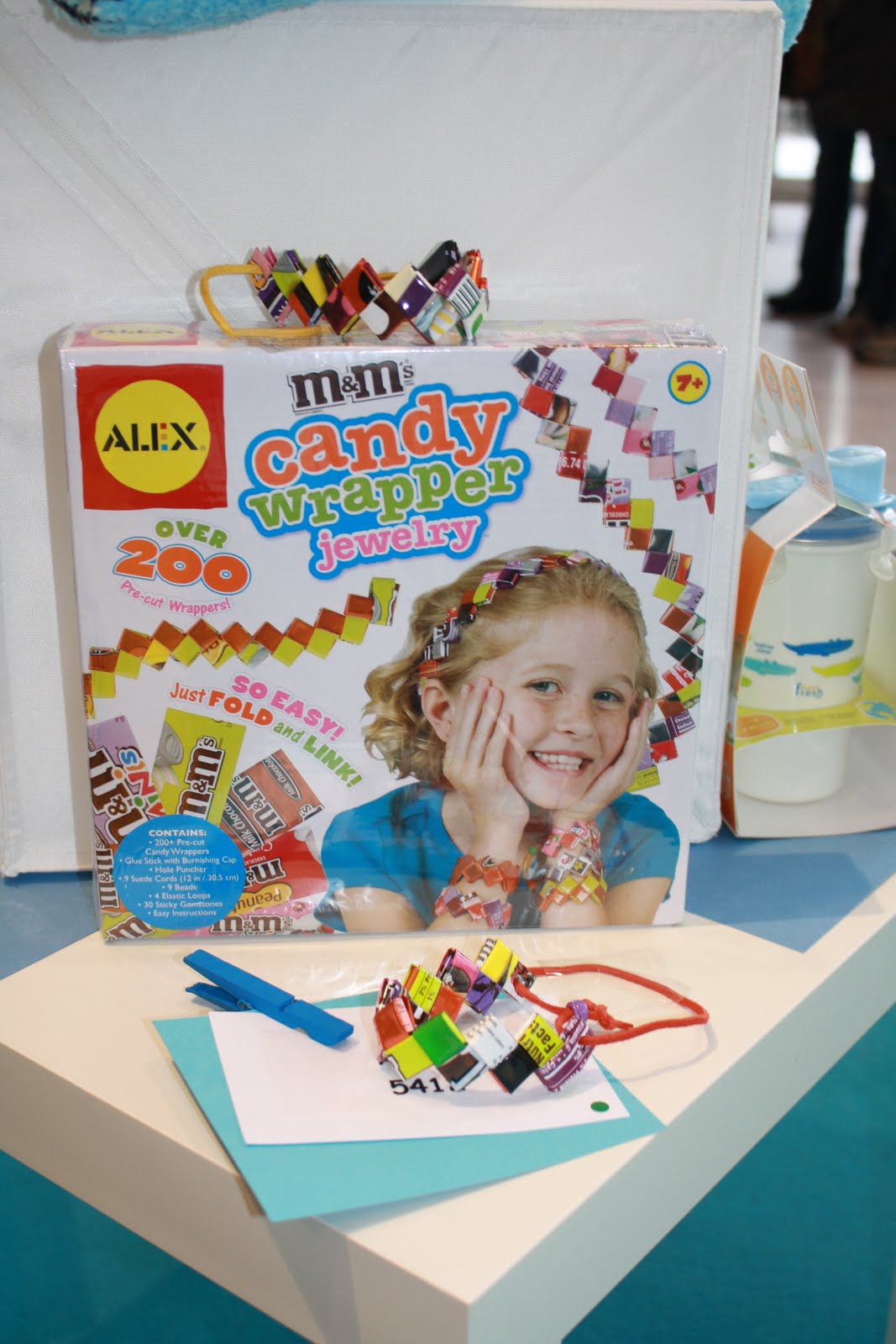 In an example of how trends quickly "trickle down" (not necessarily for the best), a few years ago at NYIGF I saw some very artistic, handmade bags crafted from candy wrappers (You probably have seen similar ones by now). Now, of course, your junior artisans can make their own accessories with an "M & M Candy Wrapper Jewelry Kit" coming soon to Alex Toys. I don't know about you, but I have enough trouble getting my daughter's mind OFF of M&M's without encouraging her to make bracelets out of the wrappers!