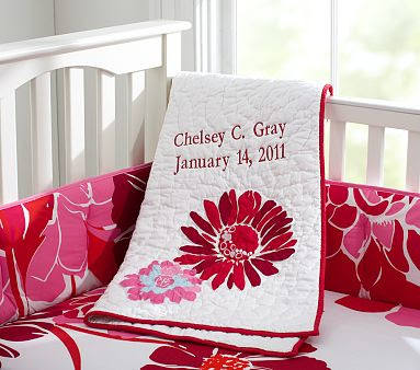 Girls' Harlington Nursery Bedding ($24-$164) at Pottery Barn Kids. Brand new to Pottery Barn Kids, the Harlington crib bedding collection reflects the growing trend of more modern patterns for nursery fabrics. I love the bright oversized red and pink florals here with just a touch of turquoise accents (see it?). By the way, did you know that Pottery Barn Kids offers complimentary design services for your child's nursery or bedroom? Neither did I. Go check it out. It sounds pretty awesome.