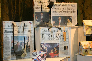 Next, Obama-fever was at an all-time high at January's gift fair. Check out these totes and accessories by The News: LA. An Obama tote- made from recycled newspapers- costs about $75.