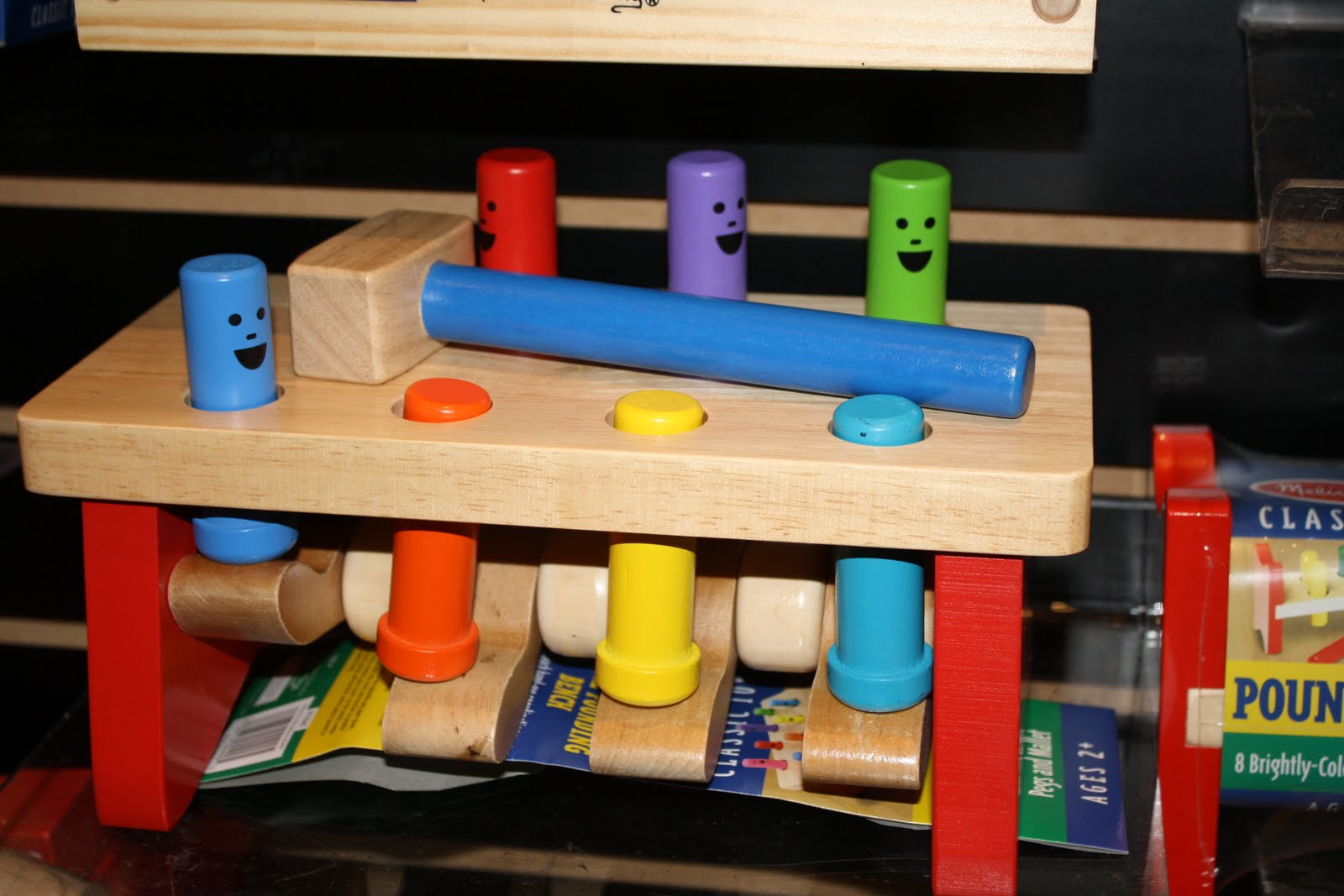 A cute variation on the classic "pound a peg" toy; this one has grinning faces that pop up each time you hit a peg down.