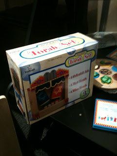 While we're on the topic of Judaism, here's my first find: the new KidKraft Torah Set ($31.48 at Amazon.com). My kids have enjoyed Kidcraft's other sets including Chanukkah and Passover; this one consists of a curtained wooden Ark to keep the plush, roll-up red and blue Torahs safe inside.