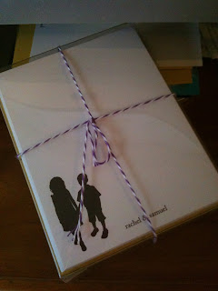 Since my kids' August birthdays are 12 days apart, and since some friends & family are kind enough to send gifts to both of them, we often write joint thank-you notes. For the past two years, I've used the custom silhouette notecards shown above by Le Papier Studio, but now that the kids are 5 and 8, their silhouettes are outdated (sniff, sniff). So I sent in a more recent photo and ordered new cards with the updated silhouette. Here is the 2011 version.